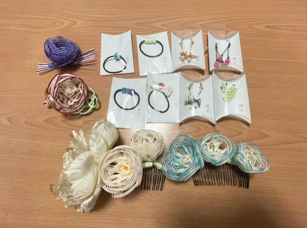 平井様は、置物や髪飾り・イヤリングなどのアクセサリー、結納品など様々な水引をすべて手作業で作られています。