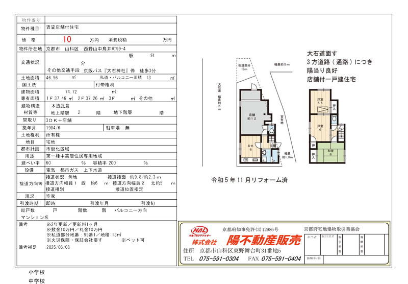 【賃貸店舗付住宅】山科区 西野山中鳥井町